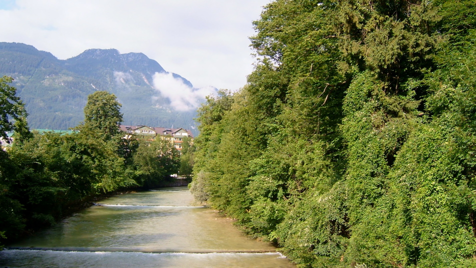 ザルツブルグからハルシュタット行きのバスに乗り、湖水地帯(ザルツカンマーグート)を縫うように走ること、1時間40分ぐらいでオーストリア最古の湯治場があるバート・イシュルに到着します。バート・イシュルは2つの川の合流点に出来た山間の町です。