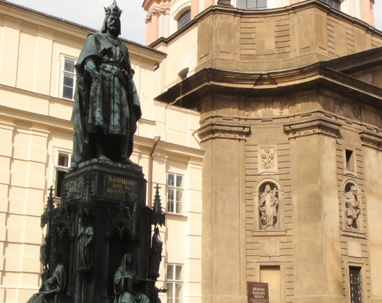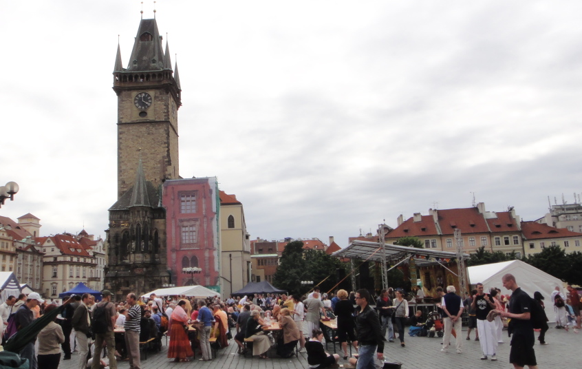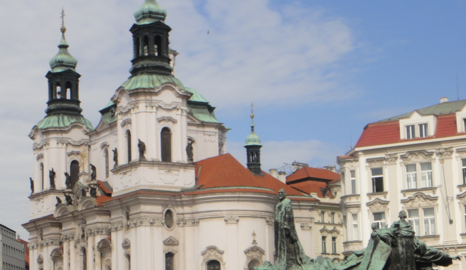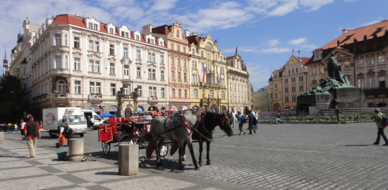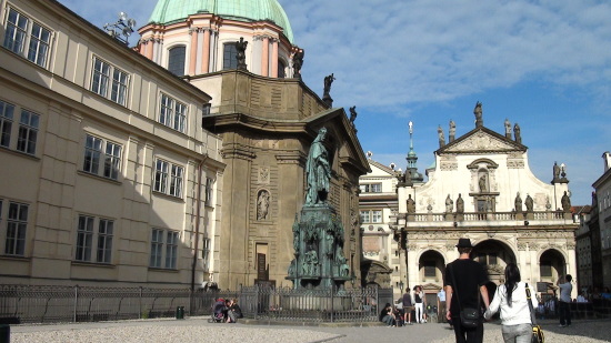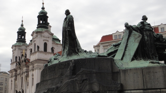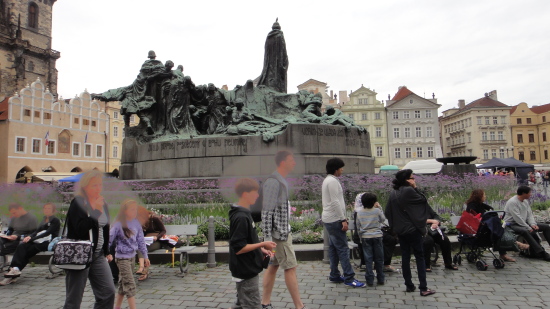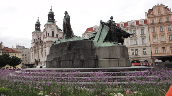 広場の中心には、自らにおける信念のためドイツのコンスタンツで火あぶりの刑に処せられた宗教改革者ヤン・フスの銅像があります。 |