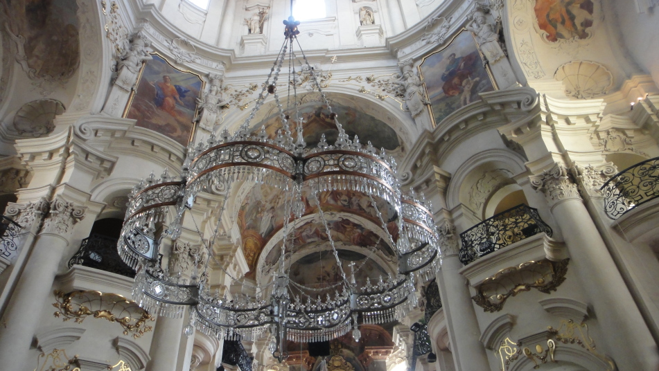 内部は華麗な天井画や重厚な彫刻で満たされており、豪華なクリスタルシャンデリアも設置されています。クラシックコンサートやミサも開催されています。 |