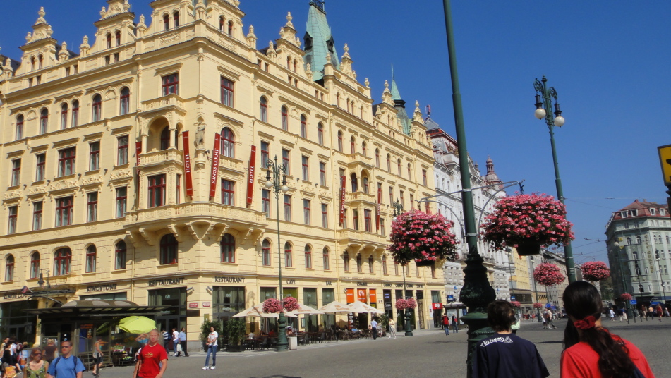 左側の建物は「ホテル キングス コート」です。右側の白い外観に赤い屋根の建物はコネクター・プレイス「Konektor Place」と呼ばれ、ČSOB銀行の支店などが入居しています。