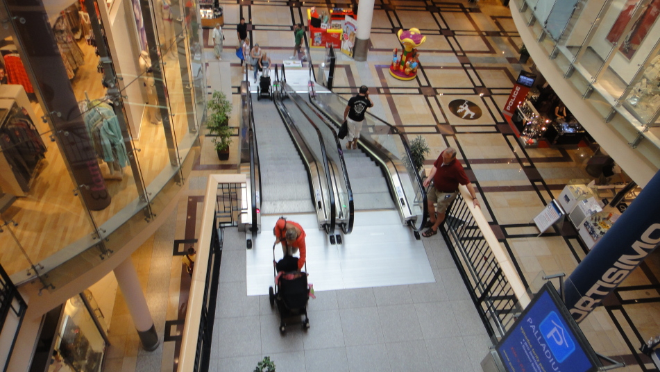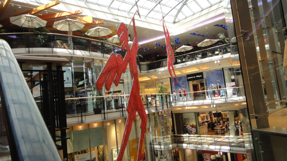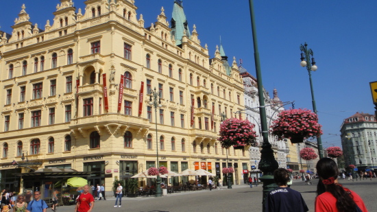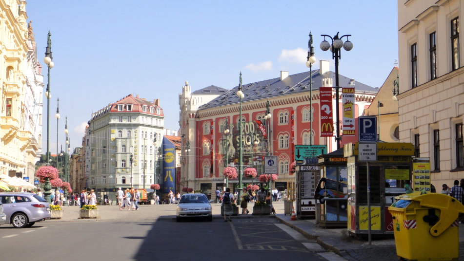 大型ショッピングモール「パラディウム」です。この広場の近くには、アールヌーヴォー建築の傑作である市民会館や、プラハの歴史的な門の一つである火薬塔などの重要な建物があります。 |