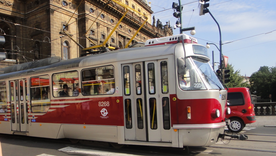 手前を走っている赤い路面電車は、プラハ市電で広く使用されているタトラT3型です。
