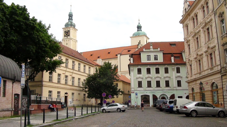 この教会は14世紀半ばに建てられたゴシック様式の教会で、1689年の火災後に再建され、ゴシック様式とバロック様式が混在する建築となりました。教会のすぐ右側には、作家フランツ・カフカの記念碑があります。