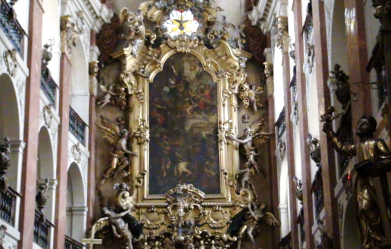 この教会は、バロック様式で再建された外観と内装が特徴で、豪華な装飾が施されています。