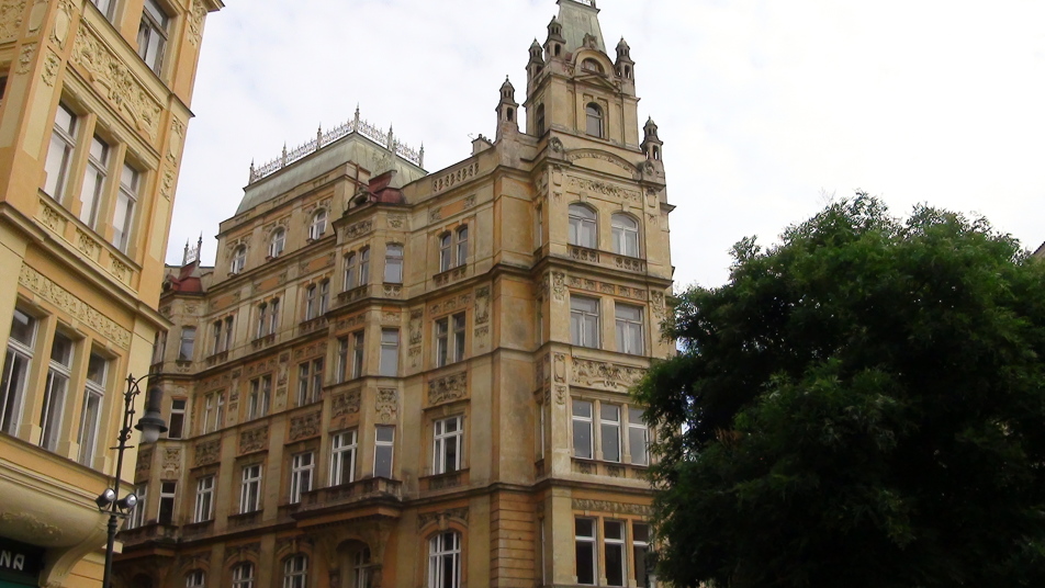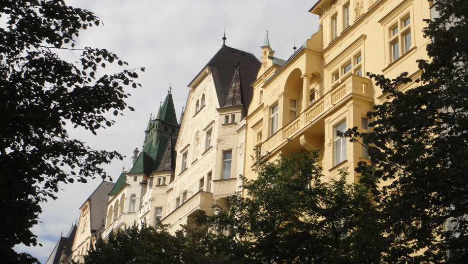 44.パリ通り「パジージュスカー通りとシロカー通り交差点」 旧市街広場からユダヤ人地区へと続く通りです。街路樹が並び、周囲の建物はパリの街並みのような豪華な外観が見ものです。