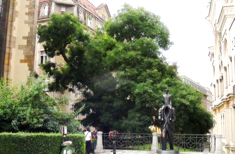 彫刻家ヤロスラフ・ロナ(Jaroslav Róna)によって2003年に制作されたブロンズ像です。高さ3.75メートルの像で、巨大な「空っぽのスーツ」の肩に小さなカフカがまたがっているユニークな姿をしています。