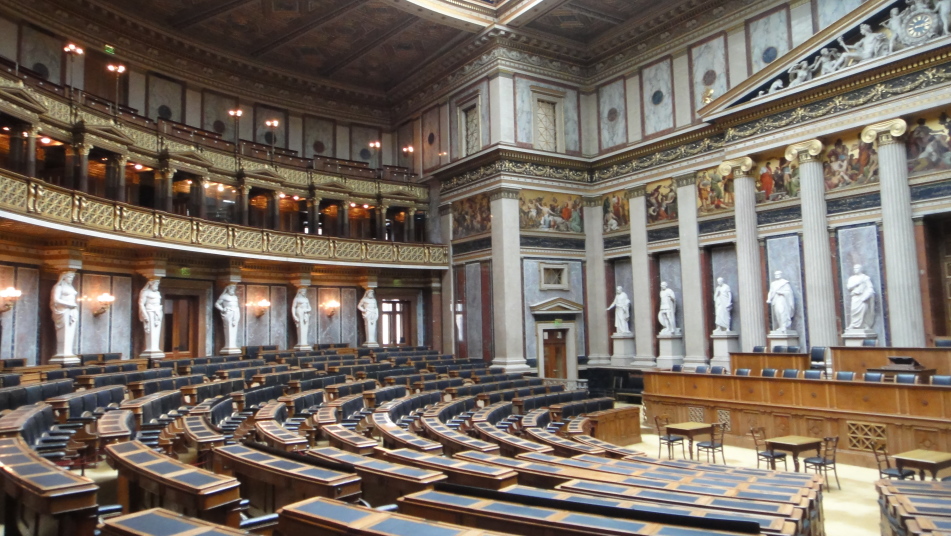 建物は、古代ギリシャの民主主義発祥の地をモチーフとしており、パルテノン神殿を連想させる太い柱が特徴的なネオ・ギリシャ様式で建てられています。 |