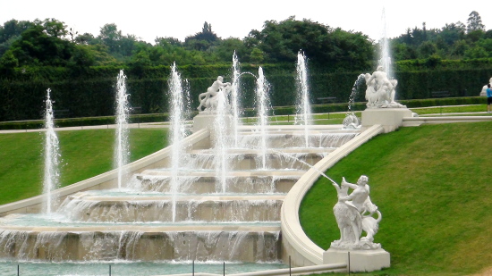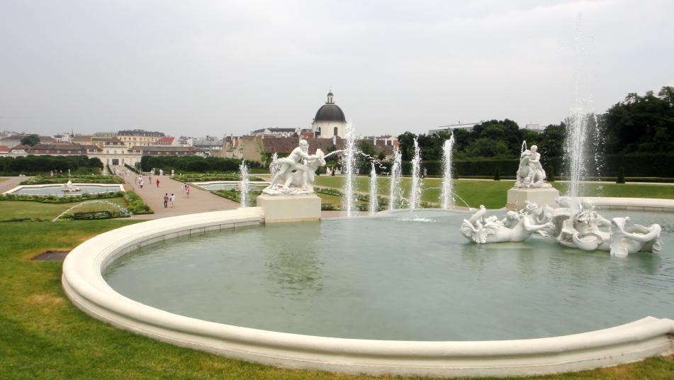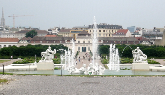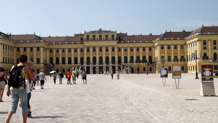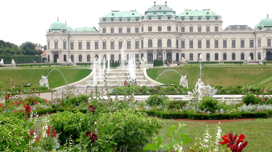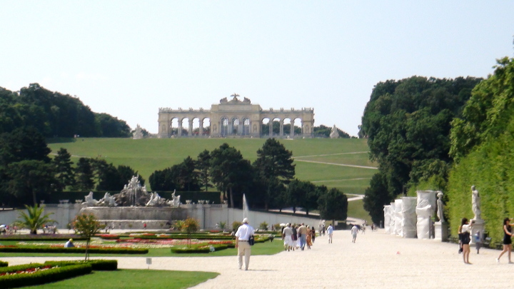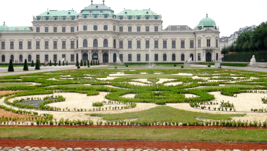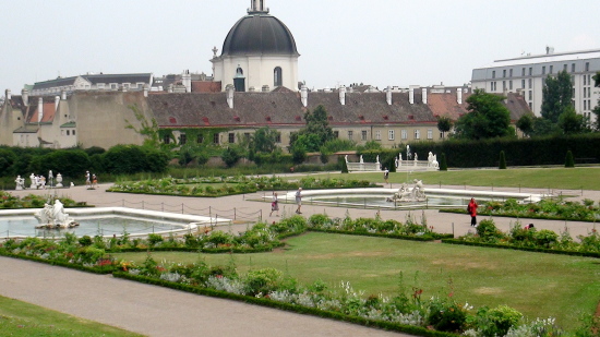 シェーンブルン宮殿は、ハプスブルク家の夏の離宮として使用されていました。宮殿の前には、幾何学的に配置されたフランス式の広大な庭園が広がっています。 |