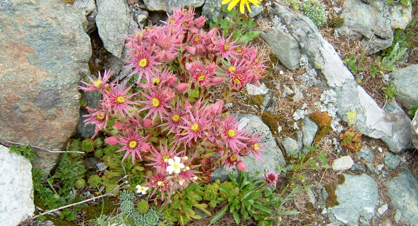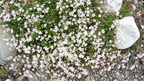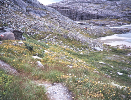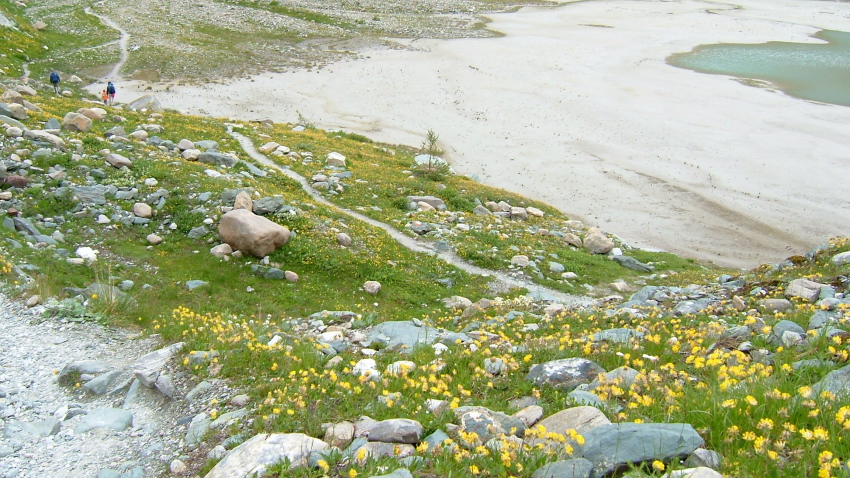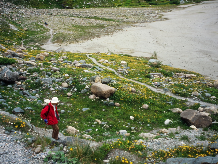 氷河の溶け出した水の流れに沿って降りてゆくと氷河の水を集めたサンダー湖に着きます。あたりは一面の高山植物に覆われており、花の絨毯のようです。