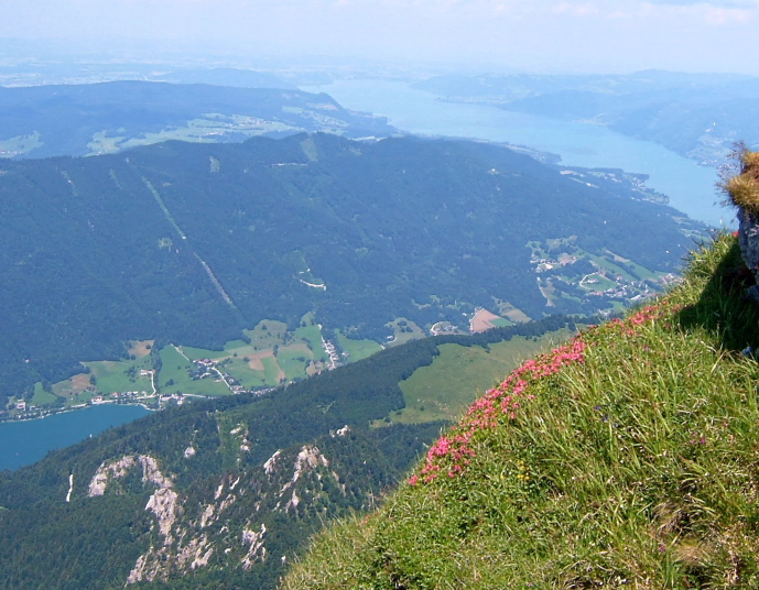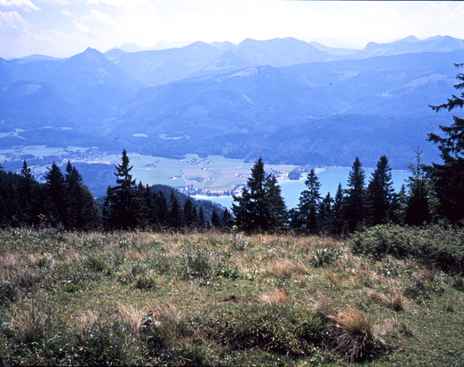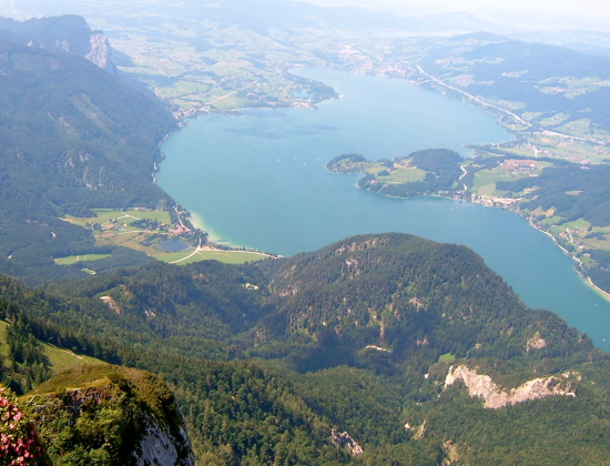 柵沿いに見渡すと、周囲の山々に囲まれるようにザルツカンマーグートの湖水がキラキラと輝いて見えます。眼下にはモントゼーMondseeが、更に北東方向にはアッターゼーAtterseeが見えます。