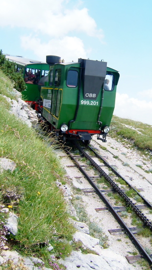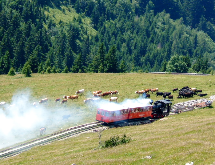 シャーフベルクSchafberg(1782m)へは、「サウンド・オブ・ミュジック」にも出てくる蒸気機関車で山の上へ行きます。途中、線路上で牛の群れに出会いましたが、牛が移動するまで列車はしばらくの間止まりました。牛が優先の土地柄のようです。