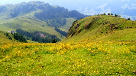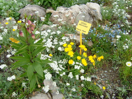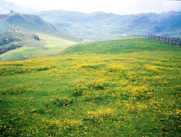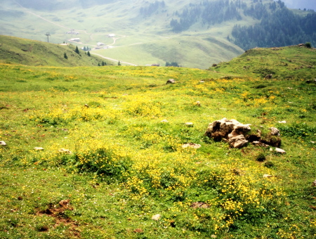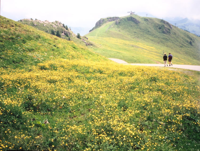 ハイキングコースは、なだらかな草原で、沢山の高山植物が高原一杯に咲いており、「花の絨毯」の言葉どおりです。高原一面が花の色(黄色)で塗りつぶされています。遠くに、ホーエ・タウエルンHohe