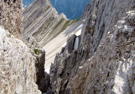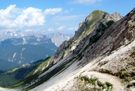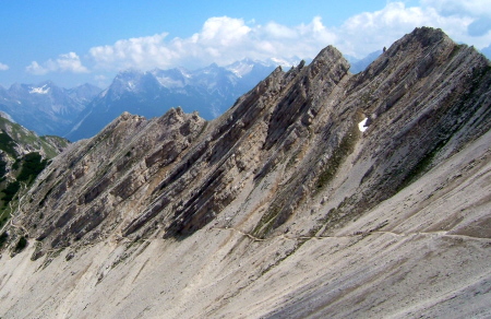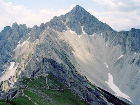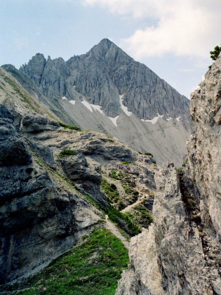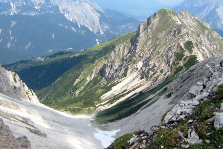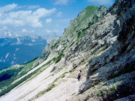 途中鞍部があり、そこから二又にルートが分かれます。右に進路をとると岩稜と砂の混じった急斜面をトラバースし、ゼーフェルダーシュピッツェSeefelderSpitze(2221m)に行きます。左に進路をとると、もと来たヘルメレコプフHarmelekopf(2050m)です。