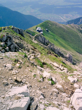 コースは、展望台までケーブルカーとゴンドラリフトで登ります。ケーブルカーの終点駅ロスヒュッテRosshutte(1751m)より、ゴンドラリフトで右尾根に有るヘルメレコプフHarmelekopf(2050m)に向かいます。ヘルメレコプフHarmelekopf(2050m)展望台の眺望を楽しんだらライターシュピッツェReitherspitze(2374m)の山頂を右側から巻きながら登ってゆくとネルトゥリンガーヒュッテNordlinger Hutte(2239m)に到着です。