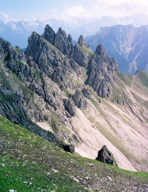 また、南のほうに目をやると、イン川を隔てて遠くにシュトゥーバイタールの山々が見えます。眼前には南から西へカルヴェンデルKarwendelの岩稜が圧倒的な迫力で迫って見えます。