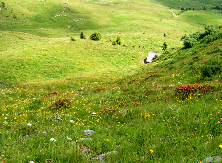 このコースは、眼下にフォーデルラナースバッハの村を見て、牛たちがのどかにアルプの牧草を食べている光景を眺めながら高原を下って行く、のんびりとした気分の味わえる山歩きのコースです。