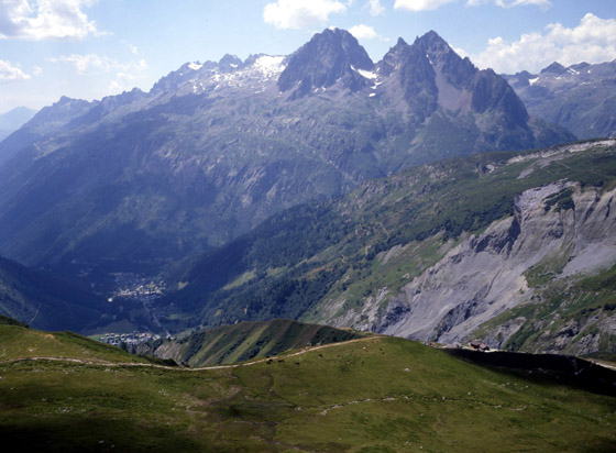 シャモニ谷の西対岸の山々(赤の針峰群)
