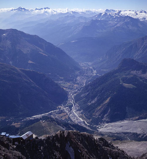 エギーユ・デュ・ミディ展望台に登るケーブルカーよりシャモニ谷を見る。