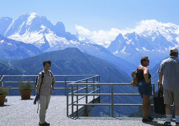 ヴェルト針峰 Aiguille Verte(4122m)が左にモンブラン(4807m)が右に見えます。