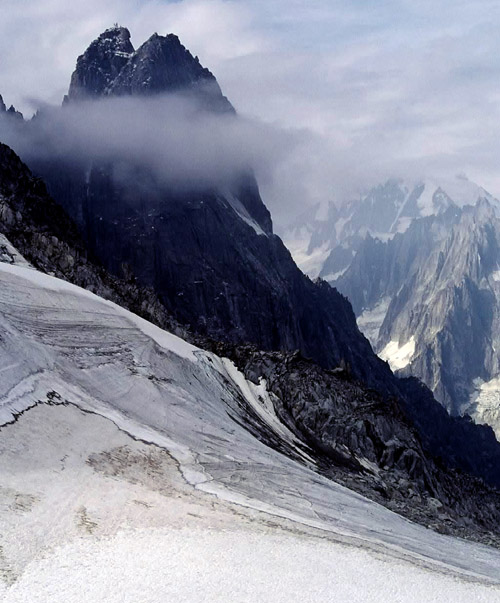 真近に見るドリュ グラン・モンテへは、アルジャンティエ−ルの町近くより2本のロープウェイを使って登ります。 あいにく天気は今一で遠望出来ませんでしたが、ドリュの中腹に漂う雲等、絵になる景色を見る事が出来ました。