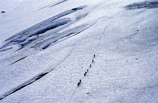 アルジャンティエール氷河を目指しトレッキングする一団
