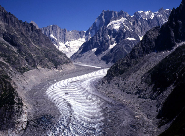 モンタンヴェールからの素晴らし眺めです。 帯のように流れているMerde Glace。ひときわ威容を誇るグランド・ジョラス。 グランド・ジョラスの北壁は、マッターホルン、アイガーの北壁ととともにアルプスの3大北壁の一つとされている。
