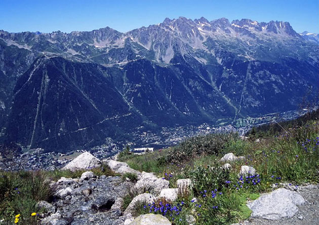 シャモニの町をはさんで対岸に見える山々は赤い針峰群 Les Aiguilles Rouges
