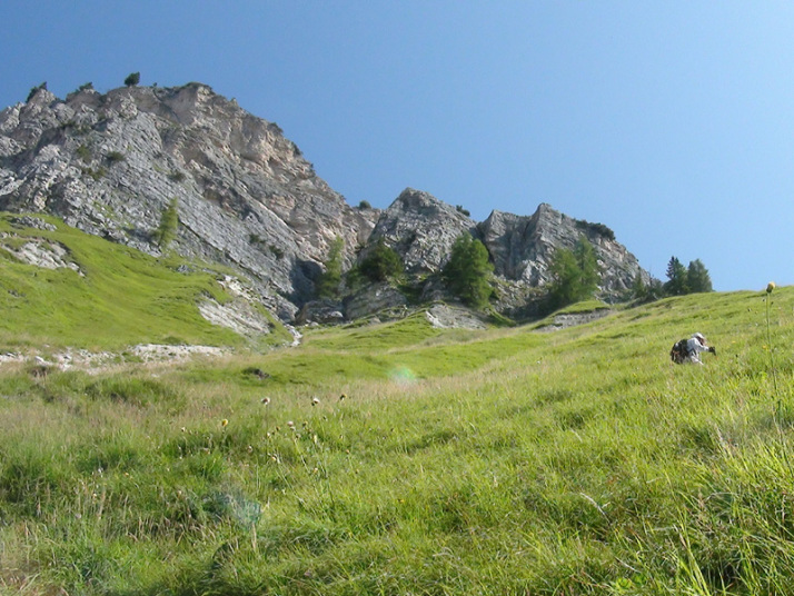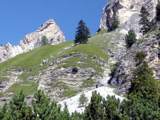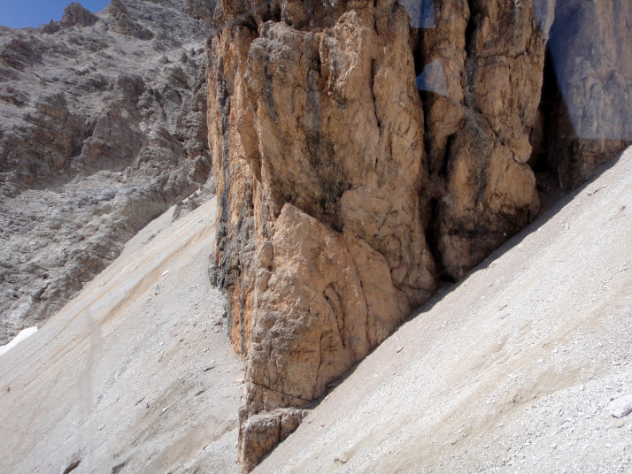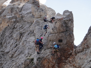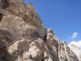 ここから山頂へ向け、「ヴィア・フェツラータ」と呼ばれる鉄のロープや梯子を使いながら岩肌を進む、難易度の高いコースに挑戦している人がいます。 |