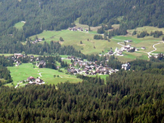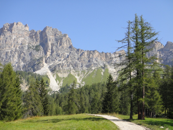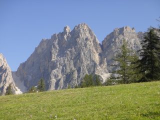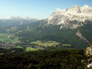 後ろを振り返るとコルティナ・ダンペッツオの街越しにトファーナTofana(3244m) ファローリアFaloria (2331m)がパノラマのように広がって見えます。 |
