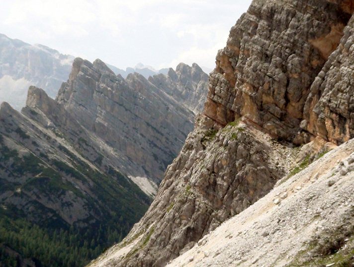 鞍部でしばらく休憩です。眼の前には、クリスタッロCristaallo(3221m)の山塊が荒々しい岩肌をむき出しています。 |