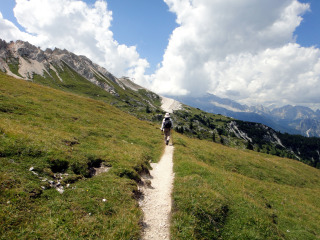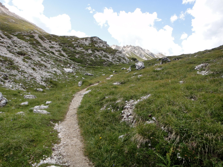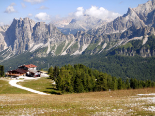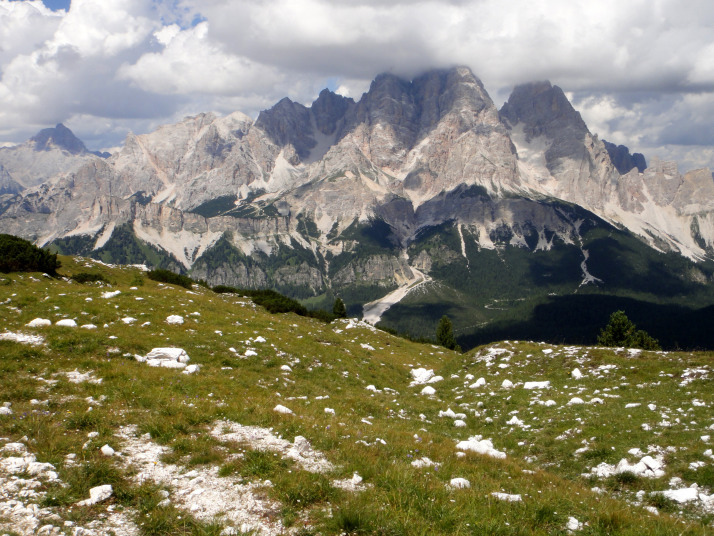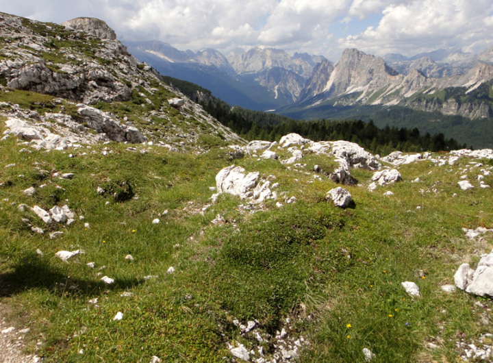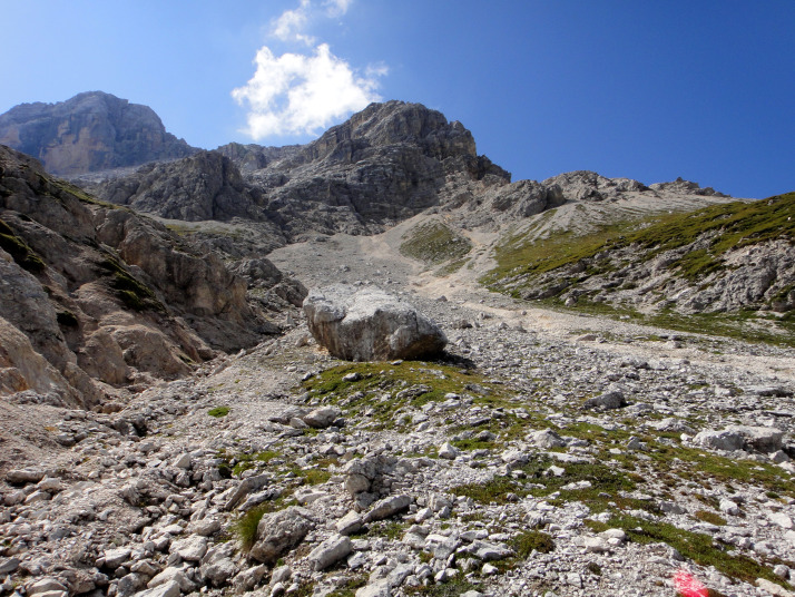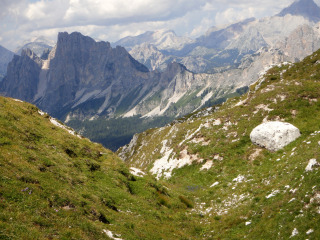 フォローリア小屋Rifugio Faloria(2123m)フォローリア小屋周辺は、草付きとなっていますが、草付きが広がる西側(手前方向)は、徐々に傾斜が強くなっています。 |