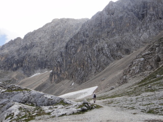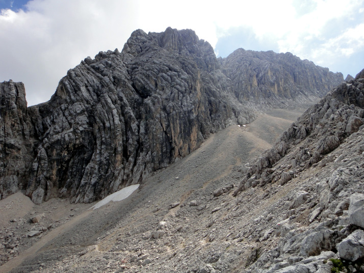 垂直の岩場とザレ場の境のルートを歩いて行きます。 |