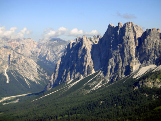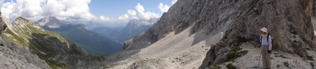 コルティナ・ダンペッツオの市街が眼下に小さくなってゆきます。谷を隔てて西正面にトファーナの山塊が見えます。 |