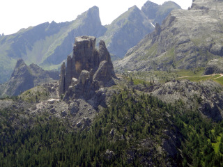 フォローリアFALORIA(2331m)、ソラピス(Punta Sorapis 3205m)の山塊が飛び込んできます。右端はアンテラオ(Monte Antelao 3263m)