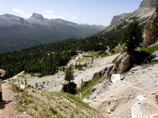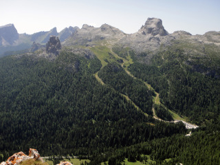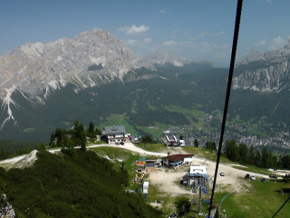 フォローリアFALORIA(2331m)後方はソラピス(Punta Sorapis 3205m)の山塊、右側にアンテラオ(Monte Antelao 3263m)が見えます。眼下は、コルティナ・ダンペッツオの街。 |