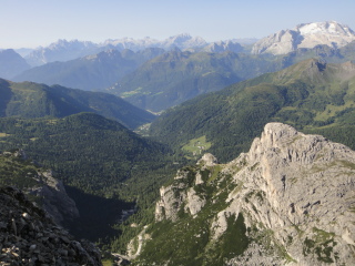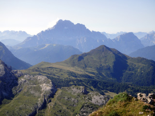 巨大な尖塔を持つ名峰チベッタ山(Monte Civetta3218m)が南方向に遠くかすんで見えます。 |