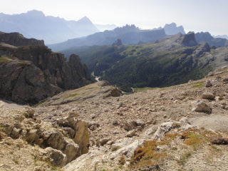 遠くにモンテ・ペルモ(Monte Pelmo3168m)が見えます。中央の霞んで見える山。