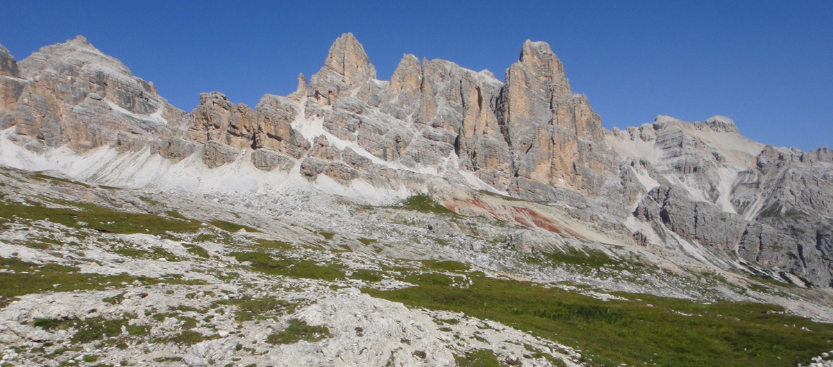 左側、奥の頂きはソラピス(Punta Sorapis 3205m)、その右端はアンテラオ(Monte Antelao 3263m)です。