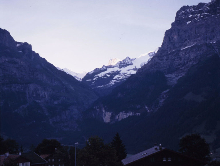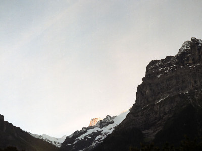 グリンデルワルトの朝。左よりヴェッターホルン (Wetterhorn3701M)、ミッテルホルン(Mittelhorn3704)、ローゼンホルン(Rosenhorn3689M)後方からあさひが、山々の稜線にあたり放射線状の陰影を見せています。