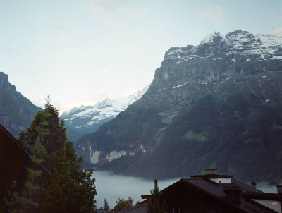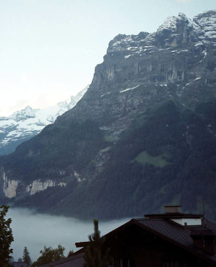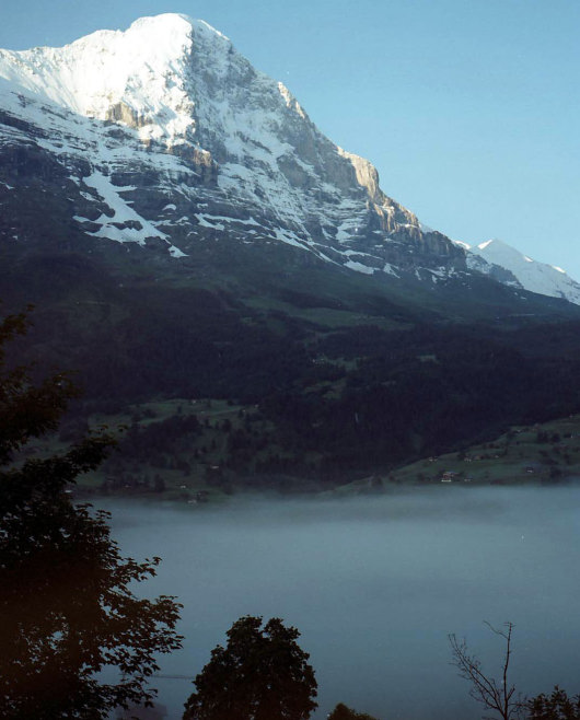 グリンデルワルドの朝 朝霧の中にグリンデルワルドの村が遠望出来ます。