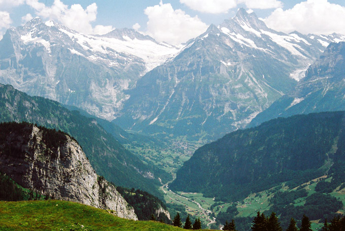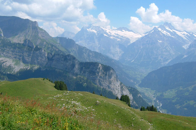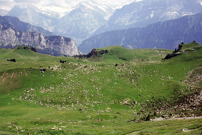 電車は急角度の山道を登り稜線を過ぎると右手方向にベルナーオーバラント三山を中心とした山々が見えてきます。