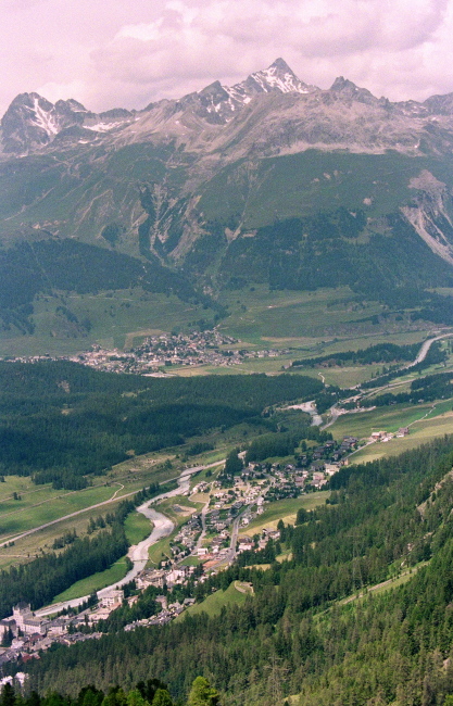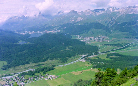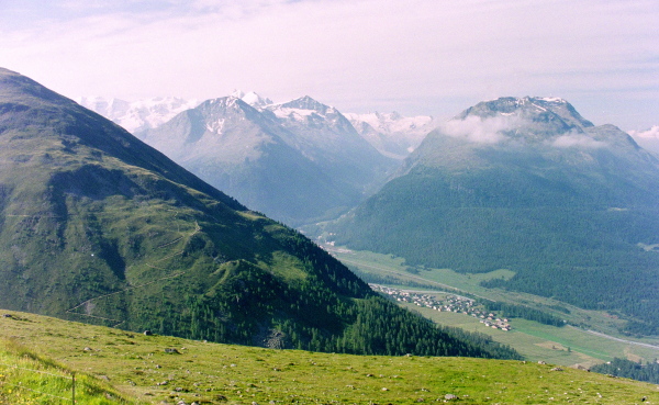 ポントレジーナ(Pontresina)の村越しに、ロゼック谷を正面眼下に見渡せます。