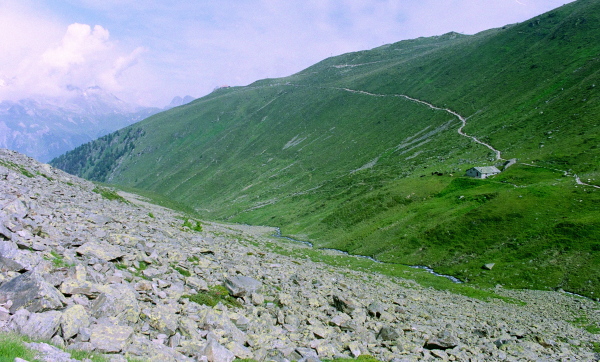 セガンティーニ・ヒュッテを過ぎ、ポントレジーナ(Pontresina)の村外れ迄山腹を巻いて行きます。 |