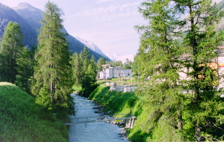 ポントレジーナの町です。ポントレジーナは、高級リゾート地、サンモリッツの近くにある町ですが、こじんまりとした静かな落ち着いた山あいの町です。