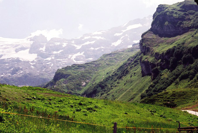 ゲンタールGental谷を登って行くと後方にベルナーオーバラントの山々が見えます。