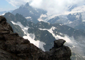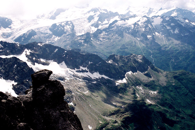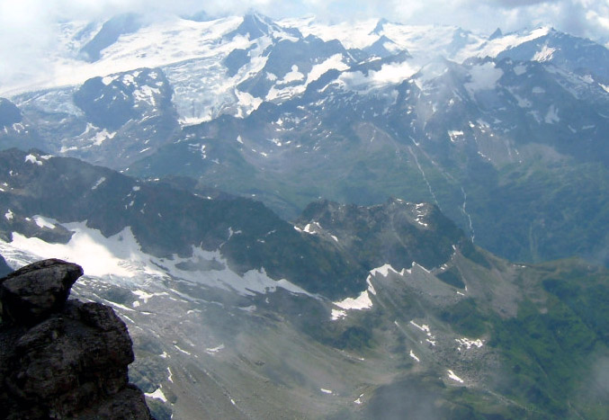 写真右よりヴェッターホルンWetterhorn3692m)、ミッテルホルンMittrlhorn(3704m)ローゼンホルンRosenhorn(3689m)が見えます。