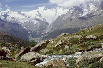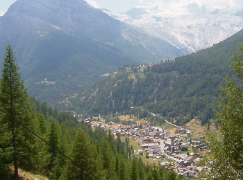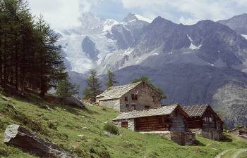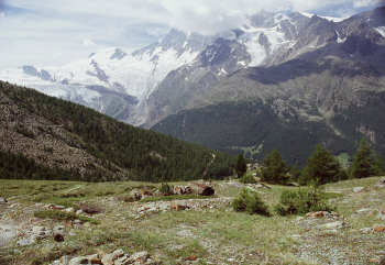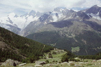 サースタールの東側にサースタールの名峰が有ります。ヴァイスミースWeissmies(4027m)とラッギンホルンLagginhor(4010m)フレッチュホルンFletschhorn(3996m)です。この山塊はサース谷を隔ててミシャベル山群と対峙しています。