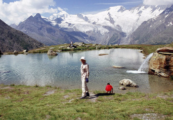 クロイツボーデン駅の側に小さな池が有ります。ここで一服して、今降りてきたヴァイスミースWeissmies(4027m)方向を眺めて見ましょう。氷河を戴いた山々が迫って見えます。
