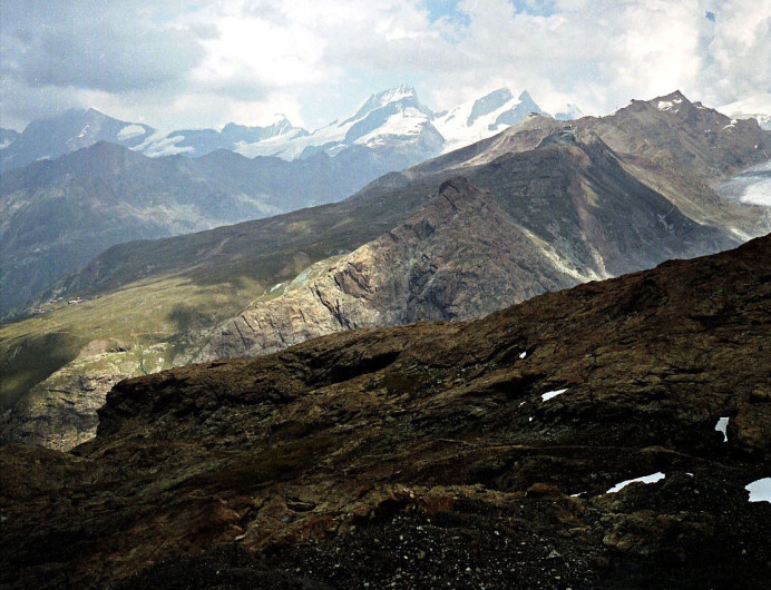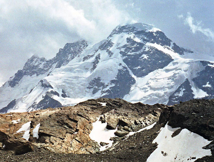 4,063m)です。画面左に遠く雪をまとっている扇のような山容はダン・ブランシュ(Dent Blanche