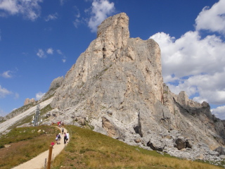 NUVOLAU(2574m) RA GUSELa(2595m)の山塊を右手に、崖下のルートを進んでゆきますNUVOLAU(2574m)のリフト(Rif.Nuvolau 2575m)が鞍部に見えます。